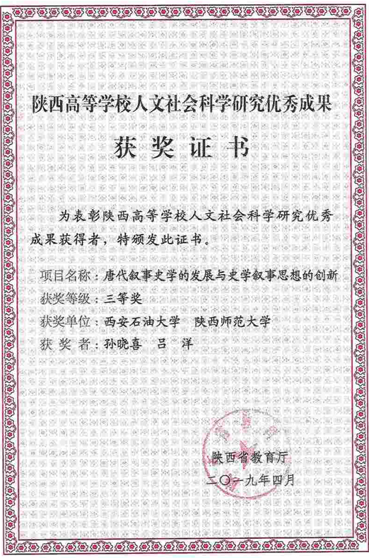 2019年陕西高等学校人文社会科学研究优秀成果三等奖(孙晓喜)