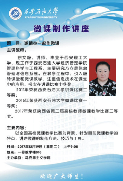 为迎接学校和全省的微课大赛并以此为契机促进教师提升教学能力,12月19日上午,304永利集团官网邀请曾获我校微课大赛一等奖的经管院徐文静老师为全体教师进行了一场生动的微课制作讲座。期间,徐老师生动、活泼的从微课制作的各个方面为各位老师进行了悉心讲解,整场气氛在热烈、务实的氛围中取得了良好效果,教师们纷纷表示受益良多。